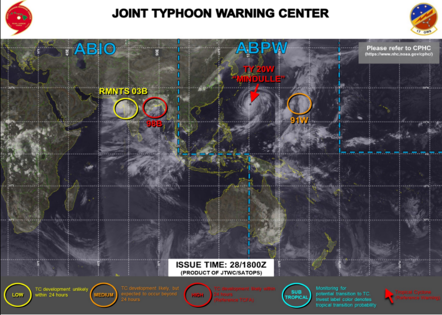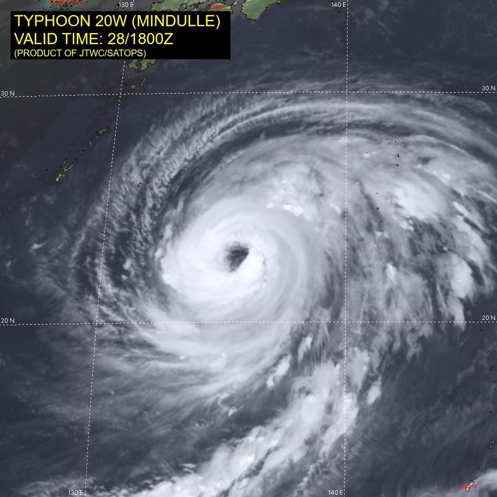 미국 합동태풍경보센터의 위성영상을 살펴보면, 태풍 민들레는 태풍의 눈이 아주 확연히 자리 잡힌 강력한 모습을 보여주고 있습니다. 동쪽으로는 91W, 즉 태풍 17호 라이언록 가능성이 아주 약하게 있는 열대저기압이 자리를 차지하고 있습니다.