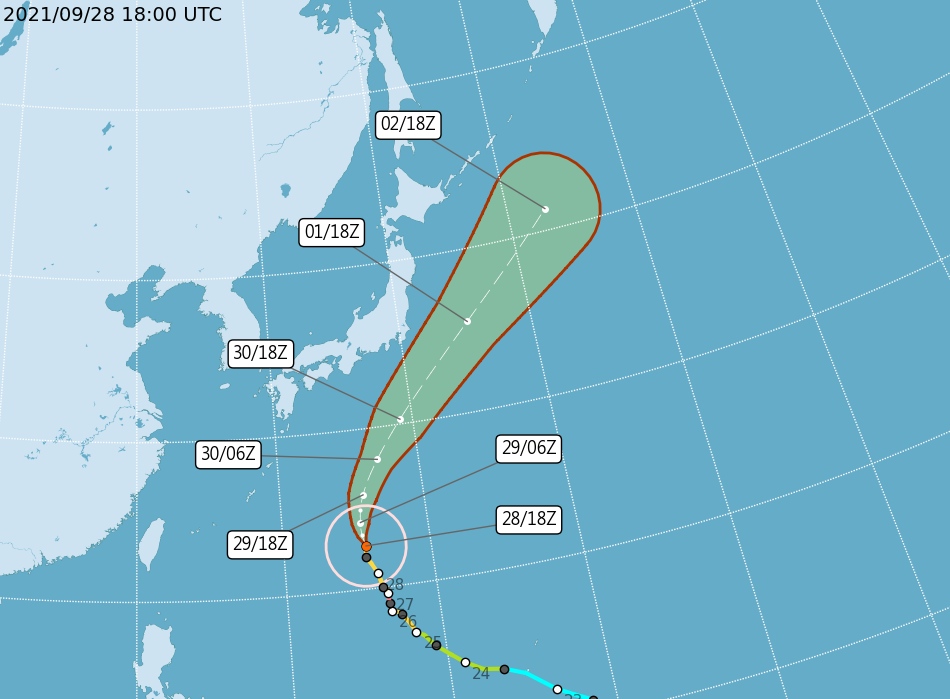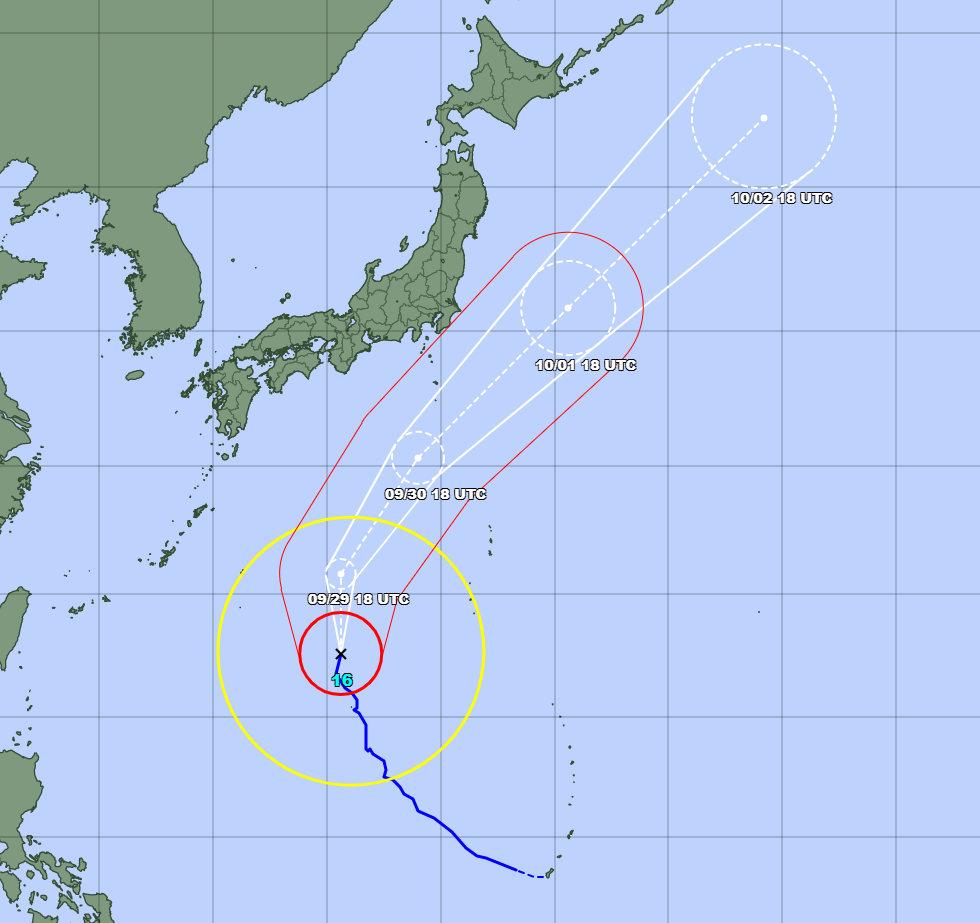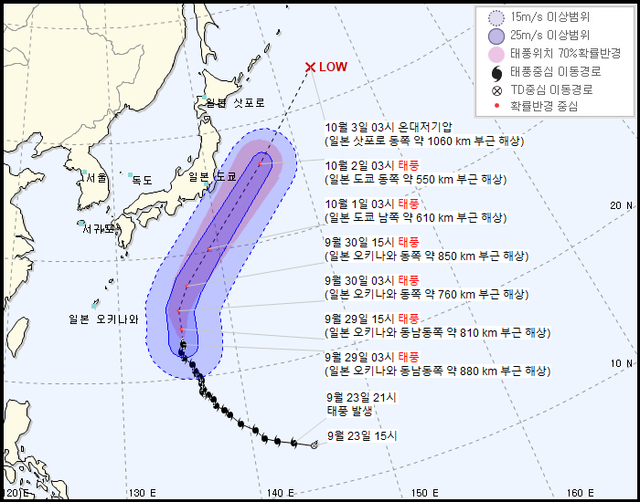 한국 기상청 9월 29일 오전 통보문에서는 일본 오키나와에서 880km 떨어진 곳에 위치한 태풍의 위치에서 북쪽으로 조금 더 올라온 후 일본 도쿄와의 거리를 조금 둔 상태에서 북동진하는 것으로 예상하고 있습니다.