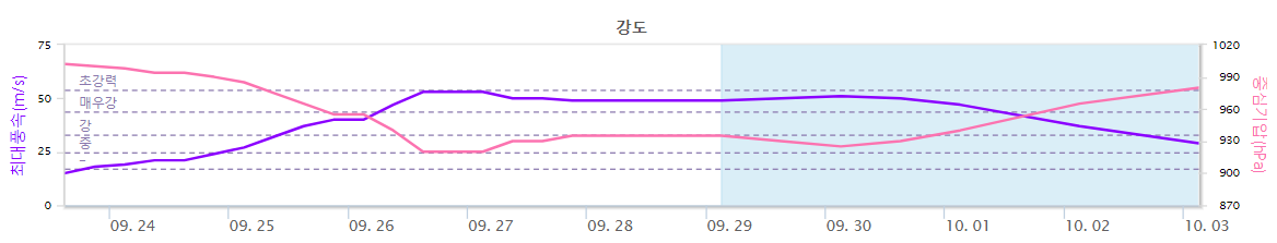 지금 <매우강>이지만, <초강력>으로 재발달의 가능성이 아주 약하게 남아 있는 상태입니다. 초강력 태풍을 직격으로 맞으면 건물이 붕괴될 정도의 에너지라는 점, 아래 태풍 강도에 대해 정리한 글 참조하시기 바랍니다.