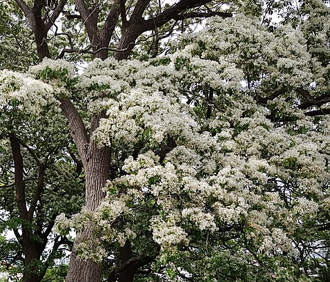 이팝나무는 가로수로 많이 심겨져 있어서 길거리에서 흔히 보고 있는 하얀색으로 눈 내리듯 덮인 나무가 바로 이팝나무입니다. 최고 20미터까지 자라는 키가 큰 나무입니다. 도심에서도 흔히 볼 수 있어요.