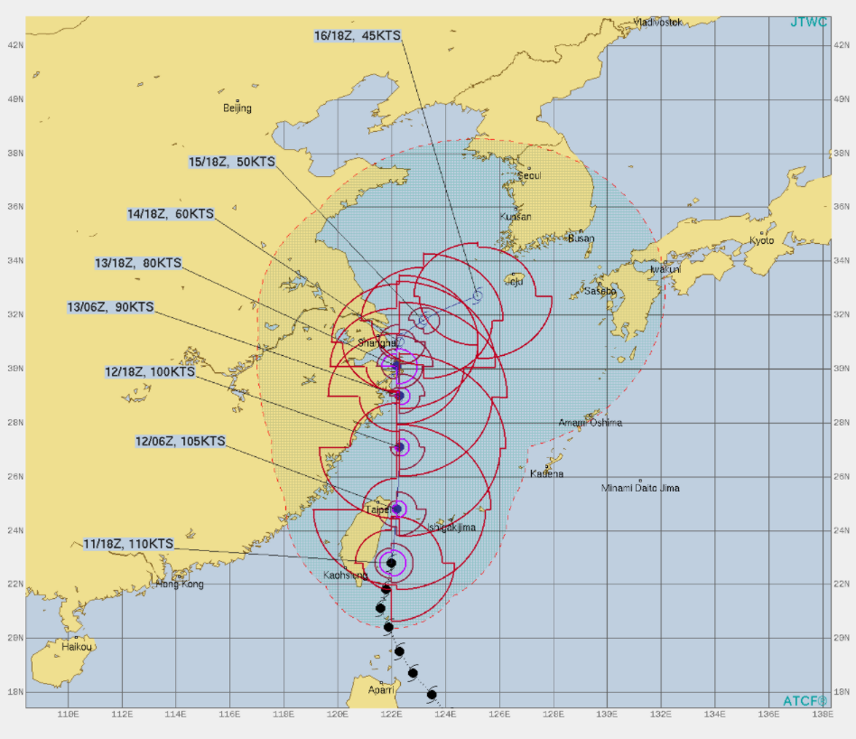 대만 기상청은 예보 업데이트가 조금 늦어서 어제 저녁 기준이어서 제주 남부로 통과하는 것으로 보고 있지만, 대만기상청이 예보를 새로 올리게 된다면 상당히 많이 북쪽으로 올릴 것 같습니다.