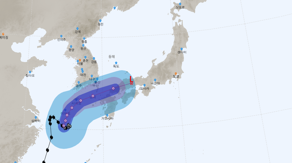 이동경로 예상입니다. 제주에서도 더 남쪽으로 치우쳐졌습니다. 아주 다행스러운 결과 같습니다. 일본으로서는 안 좋지만, 우리나라에는 최상의 시나리오가 되어 버렸습니다. 점점 남쪽으로만 예상경로가 바뀌고 있습니다.