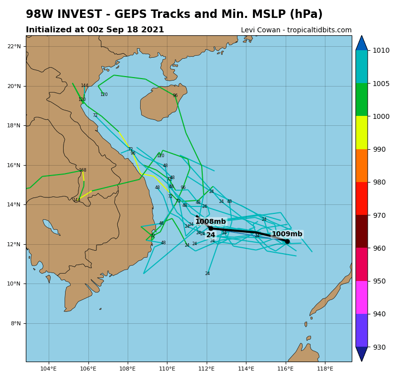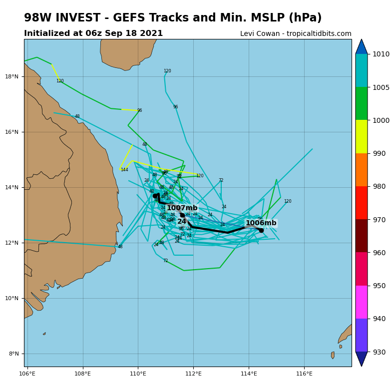 https://www.tropicaltidbits.com/storminfo/#98W 에 올라오는 2가지 주요 앙상블 예측 모델에 의하면 아래와 같이 베트남으로 바로 진행하는 것으로 예상되고 있습니다.