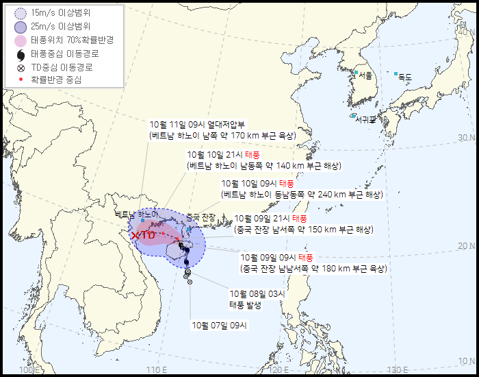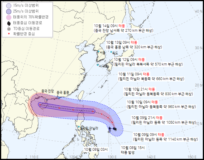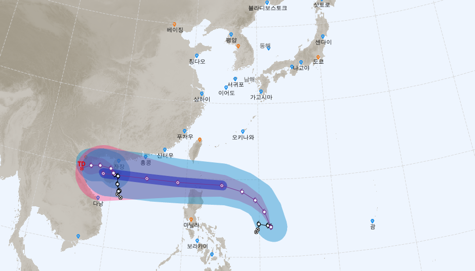 한글날인 10월 9일 오전 9시 태풍으로 발달했습니다. 필리핀 북쪽으로 통과를 한 후 남중국해에서 세력을 확장하게 됩니다. 다행히 큰 태풍은 되지 않을 것으로 보입니다. 다만, 베트남 주변에서는 3일 간격으로 태풍이 찾아오니 조금 신경이 쓰이기는 할 것입니다.