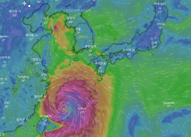 위와 같은 경로 예상도 많이 보지만, 조금 직관적이지 않죠. 그래서 많이 보는 사이트가 2군데 있습니다. 한 곳이 바로 윈디닷컴입니다.