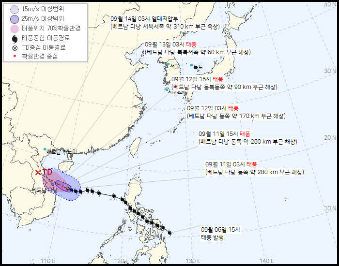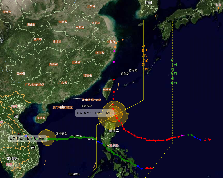 한국 기상청에서 9/11 오전 4시30분 올라온 통보문입니다. 다른 예보들과는 조금 다르게 대만의 동쪽을 관통하는 것으로 보고 있으며, 북진을 한 후 중국 해안을 스친 후 동쪽으로 빠르게 회전해 나갈 것을 보고 있습니다.
