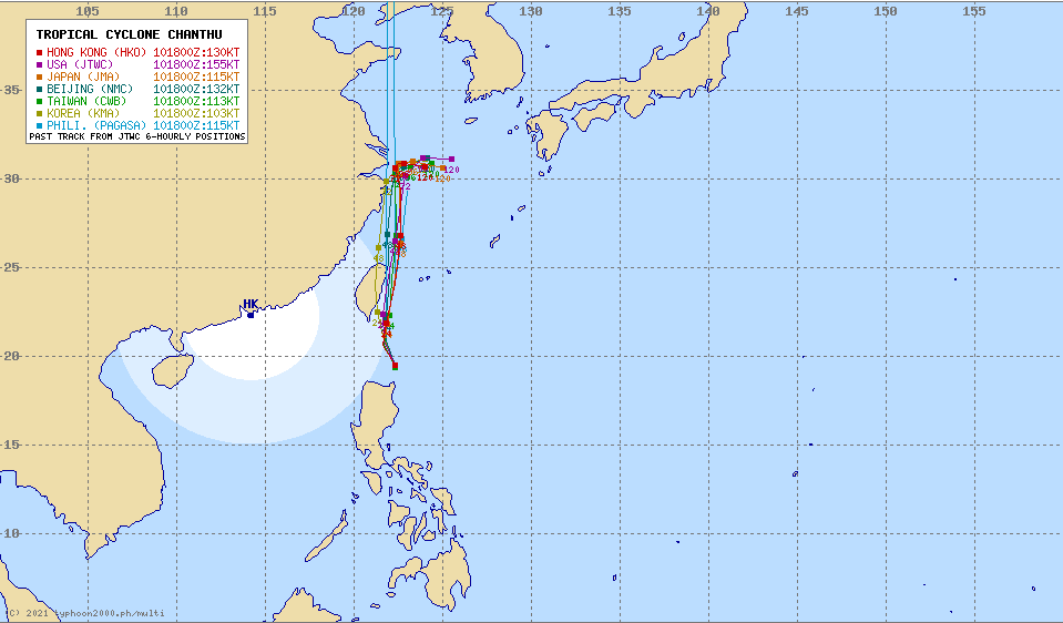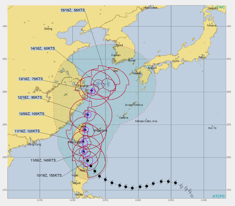 중국 기상청에서는 현재 위치에서 거의 그대로 변동없이 정북진을 하면서 중국 일부 내륙을 지나는 것으로 보고 있습니다. 대만 동쪽으로 지나는 것은 같습니다.