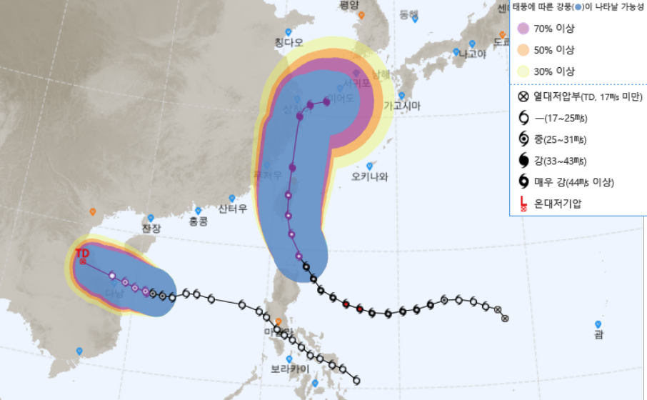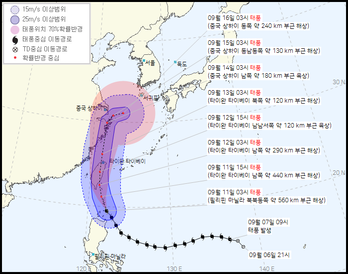 결론 먼저 말씀드리면, 우리나라에선 제주에 9월 16일(목)~17일(금)에 걸쳐 영향을 줄 것입니다. 제주 방문을 계획중인 분이 있으시다면 앞으로 기상정보에 유의해야 할 것입니다.