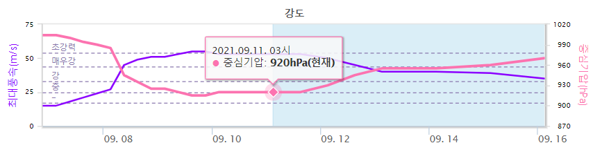 태풍 강도의 변화는 현재 중심기압 920헥토파스칼로 매우 강한 태풍 세력을 유지하고 있으며, 13일까지 조금 빠른 속도로 강도가 약해지지만, 이후 당분간 강도를 다시 유지하는 것으로 보고 있네요.