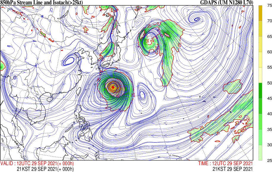 등고선으로 보면 더욱 더 위협적으로 보이지만, 우리나라에 그만큼 영향을 전혀 주지 않는다는 것도 더욱 확실해 보이죠. 민들레가 만들고 있는 써클이 아주 튼튼하고 커보이지만, 북동쪽으로 끌고 가기 때문에 우리나라에 영향은 전혀 없습니다.
