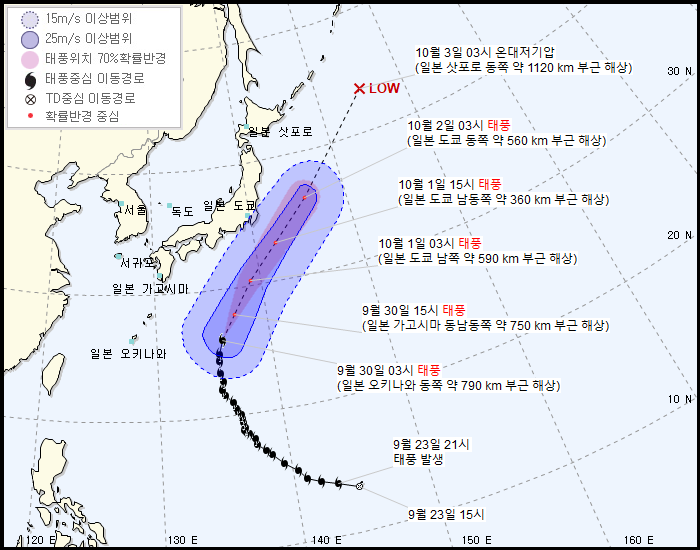 민들레 태풍 16호 예상이동경로 정보 (9월 29일)