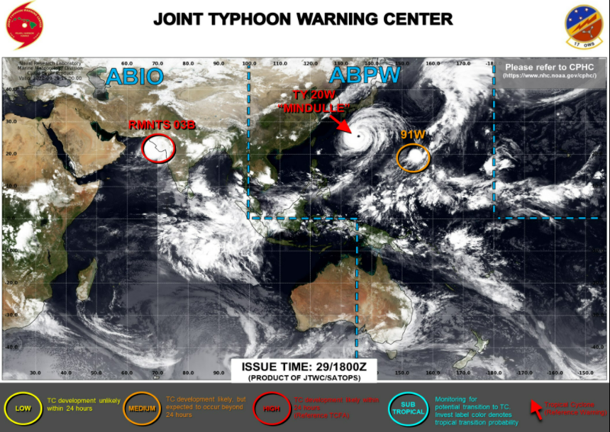민들레 우측에 저기압 91W이 하나 있는데, 17호 태풍 라이언록 발달 가능성은 매우 낮아 보입니다.