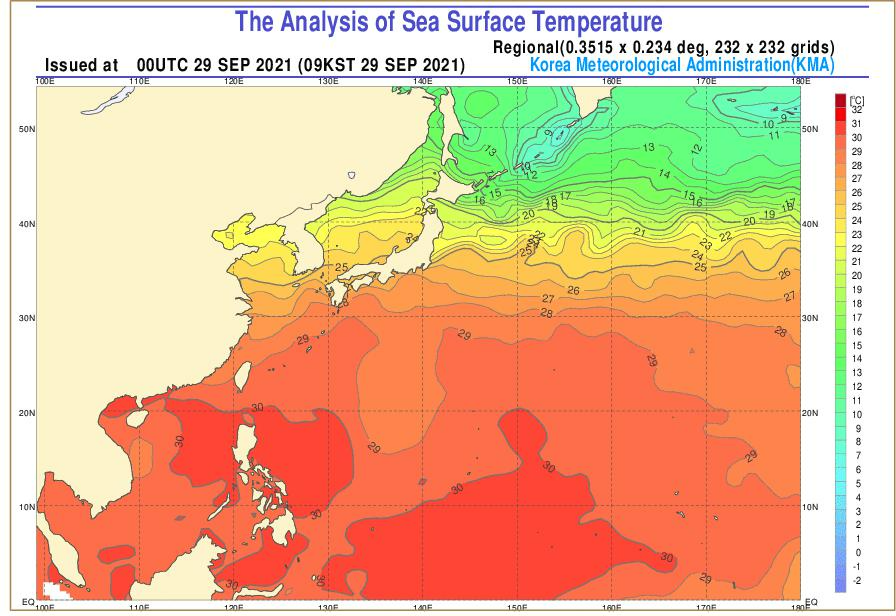 태풍이 해수면 온도가 29도 정도 되는 곳에서 이제 급격히 온도가 낮아지는 곳으로 올라왔습니다. 해수면 온도가 낮아지면 태풍은 강도가 약해지죠.
