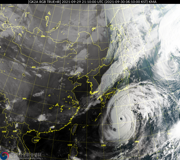 천리안에서 찍은 위성영상입니다. 태풍의 눈이 다시 또렷해졌습니다. 9월 29일 전국에 비를 내렸던 구름은 이제 부산 경남지역에 걸쳐 있는데, 곧 지나갈 것입니다. 이후 맑은 날씨는 계속됩니다.